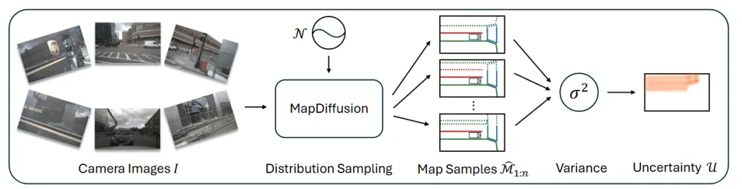 亮点:这篇论文正视了在线构建高清地图中的一个根本局限:现实路况常因遮挡、标识不清等产生地图的合理歧义。为此提出的MapDiffusion不再输出“唯一确定”的地图,而是引入扩散模型,把地图构建变成一个从噪声逐步推理出多版本合理结果的生成过程。这种做法实际上承认并建模了地图本身的不确定性——系统能同时输出多个可信的地图假设,聚合这些结果通常比单一预测更准;而各版本差异大的区域,则直接反映出高不确定性(比如被遮挡处),为规划模块提供了宝贵的风险指示。在nuScenes数据集上,该方法以单样本超越基线,多样本聚合进一步稳步提升,同时产出的不确定性地图也符合真实驾驶的直觉判断。
