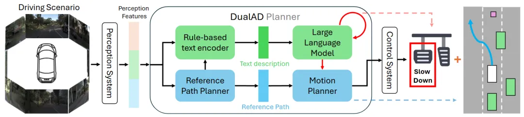 亮点:本文提出了一种双层自动驾驶框架,旨在为系统嵌入常识推理能力。其下层负责执行高频的规则化运动规划;上层则创新地利用大语言模型作为“安全监督员”——通过文本编码器将驾驶场景转化为自然语言描述,供模型进行风险推理。一旦识别隐患,上层可直接介入,执行动态限速或紧急制动。该方法的关键在于,即使使用零样本大模型,也能显著提升系统安全性,而场景描述的有效性至关重要。该设计将核心推理能力与大模型能力解耦,为未来直接接入更强大的模型提供了清晰的升级路径。