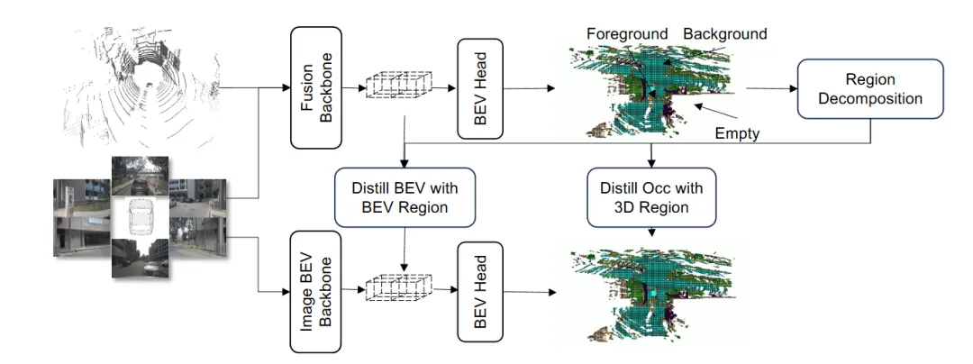亮点:本文直面3D占用预测落地中模型沉重与标注昂贵两大瓶颈,提出轻量化框架EFFOcc。其核心在于双管齐下的高效设计:模型方面,避免使用沉重的3D卷积或Transformer,转而采用以2D运算为主的高效架构,在精度领先的同时极大降低了计算负担;训练方面,创新性地引入面向占用的多阶段知识蒸馏,利用融合模型作为“教师”来指导纯视觉“学生”模型,从而大幅减少对昂贵密集体素标注的依赖。实验表明,仅需40%的标注数据,经蒸馏的纯视觉模型性能即可接近全量监督基线。该方法为高精度3D占用预测的实际部署,提供了一条通向更轻、更省、更易用的可行路径。