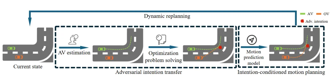 亮点:本文聚焦于自动驾驶测试中长尾危险场景难以真实复现的核心难题,提出了一种创新的对抗场景生成框架IntSim。其核心突破在于将“意图”与“轨迹”解耦处理:首先,不直接修改轨迹,而是通过一个约束优化问题,高效搜索并生成对自车构成潜在威胁的多样化驾驶意图(如卡位、逼迫)。随后,基于此意图,利用从真实数据中学到的强深度模型生成符合交通常识且看起来自然的运动轨迹,确保对抗行为像真实人类驾驶员所为。该方法进一步支持动态意图调整,从而实现自车与周围车辆之间持续、灵活的对抗性互动。实验表明,IntSim能高效生成更真实、更危险的测试场景,并且利用这些场景训练可以显著提升自动驾驶规划器在极端情况下的应对能力。