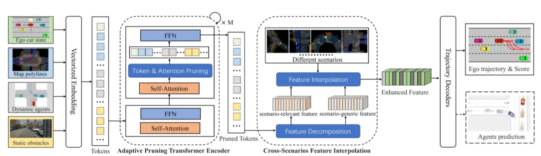 亮点:本文聚焦模仿学习在自动驾驶轨迹规划中的核心挑战:闭环测试中的“因果混淆”误差累积与训练数据的场景不均衡。为解决这两大问题,提出的CAFE-AD框架从特征层面入手,采用自适应特征剪枝过滤输入中的噪声与冗余信息,同时通过跨场景特征插值人为构造多样化的中间场景特征。这种设计让模型在训练中既专注于关键信息,又能接触到更丰富的场景变化,从而显著提升了在长尾困难场景下的规划鲁棒性。该方法在极具挑战性的nuPlan闭环测试榜上超越了现有主流规划器,为模仿学习走向可靠落地提供了新思路。