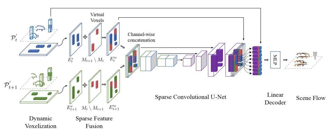 亮点:该论文针对3D场景流(描述3D点云中每个点的运动)在长距离估计时计算量激增的痛点,提出了首个面向长距离的稀疏场景流估计框架SSF。其核心创新在于摒弃传统密集网格方法,转而采用稀疏卷积网络,仅在有点云的体素中进行高效计算,从而克服了距离增长带来的计算负担。为解决两帧稀疏特征因非对齐而无法融合的关键难题,作者引入了“虚拟体素”索引补齐技术,巧妙地实现了跨帧稀疏特征的对齐与有效融合。此外,通过设计距离加权的训练损失,使模型更专注优化远距离点的运动估计精度。在Argoverse2数据集上的实验表明,该方法在长距离场景流估计任务上达到了领先水平。