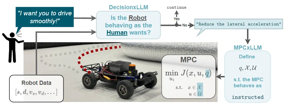 亮点:本文致力于将大语言模型(LLM)务实且高效地部署到车端,以补足传统数据驱动方法在常识推理上的短板。其核心是提出一种混合决策架构,让LLM与传统模型预测控制(MPC)各司其职:首先由 DecisionxLLM 对齐人类指令与车辆状态,进行高层理解与决策偏好判断;随后由 MPCxLLM 将此偏好转化为对 MPC 控制器参数(如代价函数权重)的实时调整,而安全底层的控制仍由MPC严格保证。为实现车载实时运行,作者系统地采用了检索增强(RAG)、LoRA微调与量化等“上车三件套”进行优化。实验表明,该框架不仅显著提升了决策准确性与控制适应性,更在推理效率上实现了数量级提升,证明了其不只是一个概念,更是一条通往实用落地的清晰技术路径。