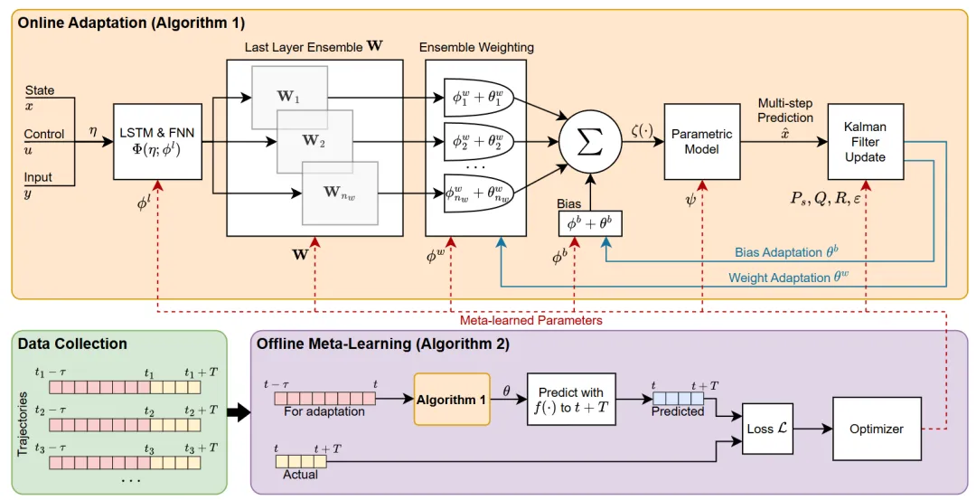 亮点:这项研究直面越野自动驾驶的核心挑战:多变地形导致车辆动力学模型难以准确建模。为解决此问题,作者提出了一种结合元学习(离线准备)与在线滤波(实时适应) 的两阶段方案:离线阶段,通过元学习提炼出能快速适应新地形的模型结构与调整策略;在线运行时,则基于卡尔曼滤波机制,实时利用传感器观测微调动力学模型参数,实现“边跑边学”。该方法最终服务于模型预测控制,在大量测试及全尺寸实车验证中,其预测准确性、控制性能与安全性均超越基线,尤其在危险、易失稳的场景中表现更为突出。