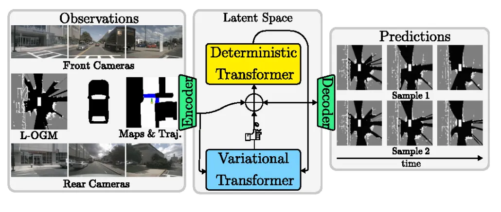 亮点:本文针对自动驾驶环境预测中“未来唯一确定”这一不切实际的假设,提出了一种名为LOPR的潜空间生成式预测框架。其核心思路是将未来的多种可能性建模于一个隐变量空间中,从而自监督地生成多样且合理的未来占用栅格,而非单一确定结果。该框架能灵活融合图像、地图及自车轨迹等多种条件信息,使预测更贴合实际驾驶上下文。为实现高效部署,它创新地提供了两种解码模式:轻量一步解码保障实时性,扩散式迭代解码则进一步优化时间连贯性与细节质量。实验表明,该方法在nuScenes与Waymo Open数据集上全面超越了传统方案。
