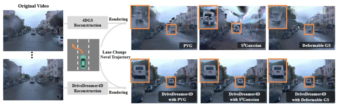 亮点:这篇论文聚焦于自动驾驶仿真中传感器渲染的核心痛点——如何在自车执行变道等复杂新轨迹时,仍能生成物理一致、时空连贯的可信画面。传统基于重建的方法(如4DGS)严重受限于训练数据(多为前向行驶)的分布,一旦视角或运动超出该范围,渲染质量便急剧下降。为此,作者创新性地提出DriveDreamer4D,其核心思路是将驾驶视频生成模型(World Model)转化为一个“数据引擎”,用以合成真实世界中稀缺的复杂驾驶轨迹视频。通过引入结构化条件生成机制,该方法确保了合成视频中动态元素的时空一致性,进而将这些高质量的合成数据与真实数据共同优化4D高斯场景表示。此外,提出的“cousin data”训练策略有效缓解了合成数据带来的分布偏移问题。实验表明,该方法在新轨迹视角生成质量(如FID指标)和动态元素的物理一致性(如NTA-IoU)上均显著优于现有方法,首次实现了通过生成模型来系统性提升驾驶场景的4D重建与渲染能力。