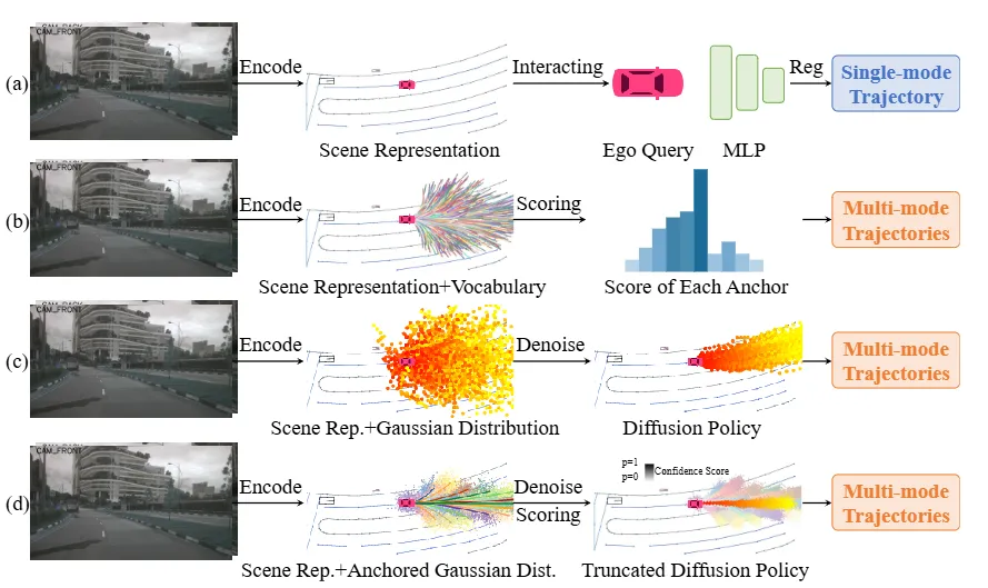 亮点:这篇论文解决了端到端自动驾驶中扩散模型生成多样性与推理实时性难以兼得的核心矛盾。提出的DiffusionDrive通过引入先验的多模态锚点与截断扩散机制,实现了高效推理。其核心思路是从一组代表常见驾驶意图的轨迹锚点出发进行快速去噪,而非从纯噪声开始漫长迭代,从而将去噪步数减少一个量级。结合级联式扩散解码器设计,该方法在确保生成轨迹多样且合理的同时,达到了接近实时的推理速度,为扩散模型在动态驾驶场景中的实际部署提供了可行路径。