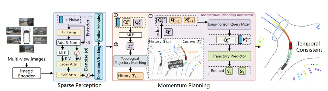亮点:该研究针对端到端自动驾驶规划中因缺乏历史连续性导致的控制抖动与轨迹不稳定问题,提出了一种引入“动量”感知的规划框架MomAD。其核心在于强制当前决策与历史规划保持一致,具体通过拓扑轨迹匹配筛选与过去最连贯的轨迹候选,并利用动量规划交互器融合历史信息来稳定场景理解与长时域预测。该方法在训练中还结合了实例去噪以提升对噪声的鲁棒性,并提出了新的轨迹一致性评估指标。实验表明,MomAD显著提升了长时域规划的平滑性与安全性,在nuScenes等基准上降低了碰撞率并提高了闭环驾驶成功率,使端到端驾驶行为更接近人类连续、稳定的决策模式。