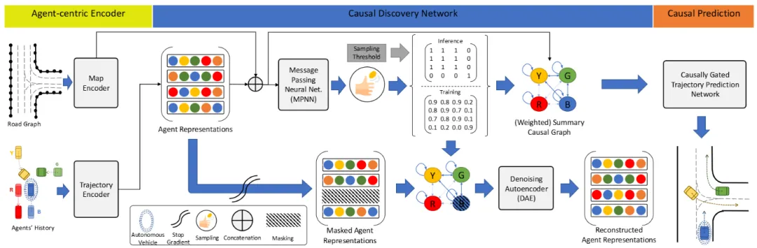 亮点:这篇论文揭示了轨迹预测中一个关键但常被忽略的问题:模型容易被与自车决策无关的交通参与者所干扰。为解决此问题,作者提出CRiTIC框架,其核心创新在于引入显式的因果关系建模:首先通过一个子网络自动发现历史交互中“谁真正影响了谁”的因果图,随后在Transformer预测器中利用此因果图对注意力进行门控筛选,从而引导模型聚焦于具有因果关联的关键参与者,而非被无关的“路人”行为所误导。该方法显著提升了模型对无关扰动与分布外场景的鲁棒性(最高达54%)与泛化能力(跨域性能提升达29%),在保证预测精度的同时,使预测结果更为专注和可靠。