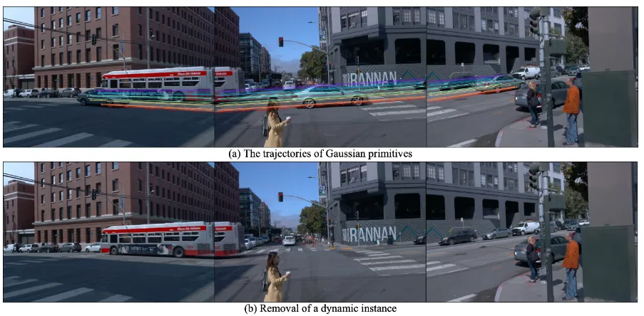 亮点:这项研究致力于解决自动驾驶仿真中动态场景重建对高精度、高成本位姿标注的严重依赖问题。为此提出的BézierGS方法创新性地使用可学习的贝塞尔曲线来建模动态物体的运动轨迹。其核心在于将动态物体的运动视为一条时间上连续、可微的平滑曲线,而非依赖可能含噪的离散位姿标注,从而以曲线本身的连续性自动纠正标注误差,并实现更合理与连贯的运动表示。该方法还通过针对动态渲染的额外监督与曲线间的一致性约束,提升了动态与静态场景元素分离与重建的质量。实验表明,在Waymo和nuPlan等数据集上,该方法在新视角合成与动态/静态重建质量上均超越了现有主流方法。