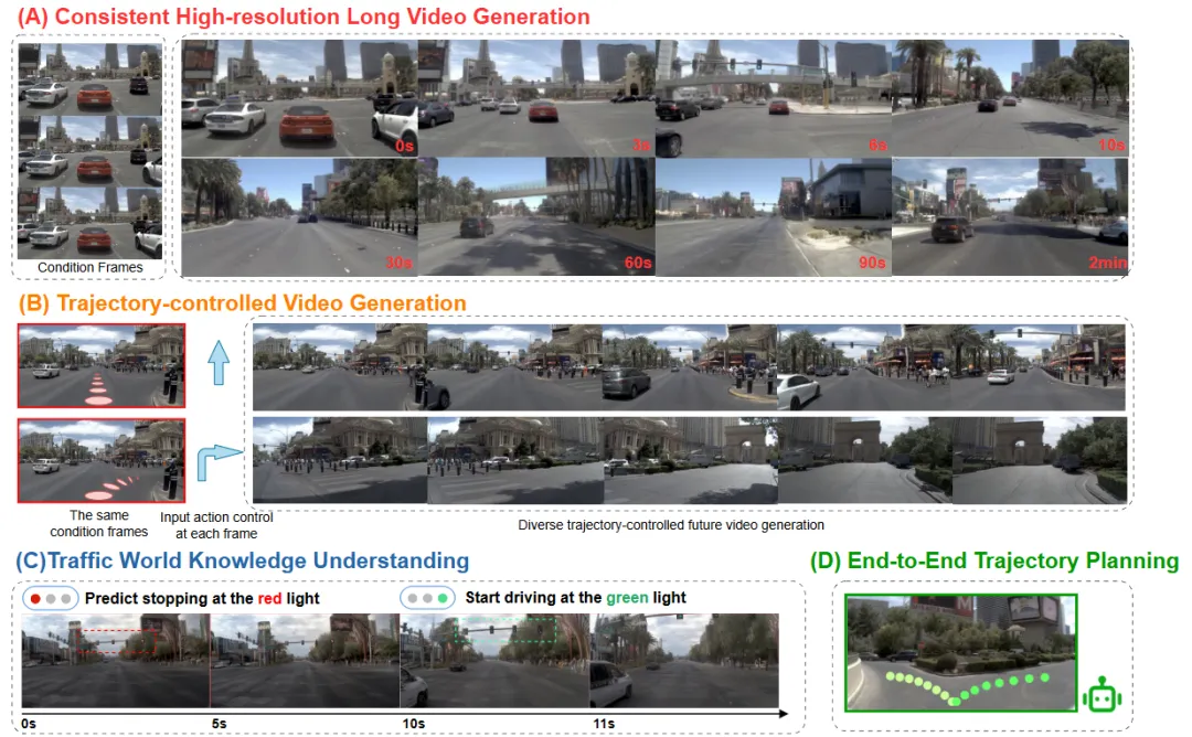 亮点:这篇论文旨在将自动驾驶中的“世界模型”从一个被动的未来视频生成器,升级为一个能进行长时预测与实时规划的主动决策引擎。针对现有视频扩散模型难以生成灵活时长预测、且与规划任务割裂的局限,其提出的Epona框架核心在于自回归扩散范式,即将未来拆解为逐步生成的步骤,实现更可控的长时预测。为此,它引入了解耦的时空因子分解来分别建模动态规律与细节生成,并采用模块化设计将轨迹预测与视频生成紧密结合,使模型能一体输出可执行的规划。通过链式训练策略缓解了自回归的误差累积问题。实验表明,Epona不仅在长时视频生成质量(如FVD指标)上取得提升,支持分钟级预测,其学到的世界模型更能直接作为实时运动规划器,在NAVSIM等基准上超越主流端到端方法,真正推动了世界模型从“生成观看”走向“决策使用”的质变。