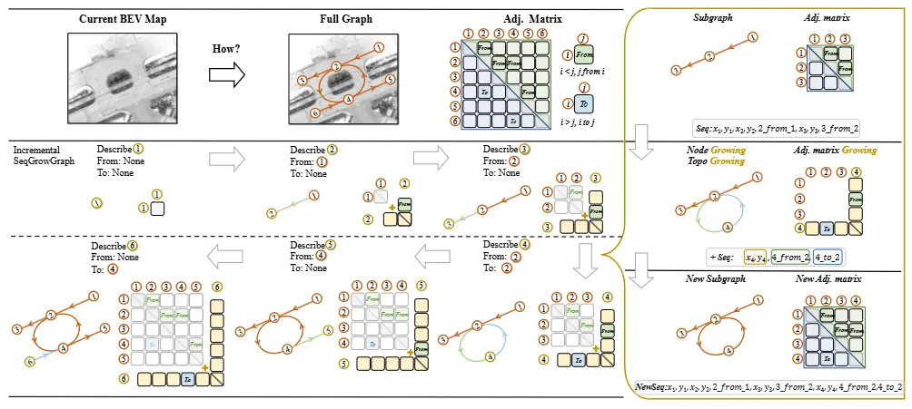 亮点:这篇论文致力于解决自动驾驶高精地图构建中复杂车道拓扑结构难以统一建模的根本挑战,提出了一种新颖的“逐步生长”式图生成框架SeqGrowGraph。该方法将车道拓扑建模为一个自回归的图扩张过程:模仿人类绘图习惯,模型每一步只预测新增的一个拓扑节点及其与现有节点的连接关系,并利用二次贝塞尔曲线参数化车道几何。通过深度优先顺序将图生成序列化,使得Transformer能够有效处理这一动态结构。该框架统一且稳健地学习了车道连接与几何形状,在nuScenes与Argoverse2数据集上取得了领先性能。