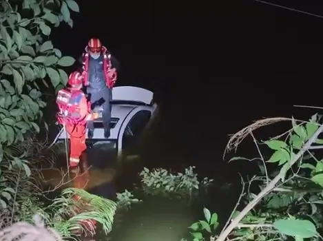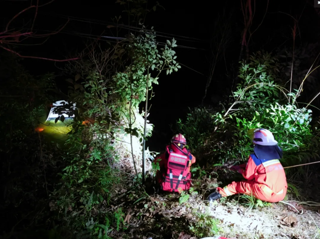 寒夜中,救援人员抵达事发地点时,落水车辆大部分浸泡在水中,驾驶员正蹲坐车顶焦急等待救援。