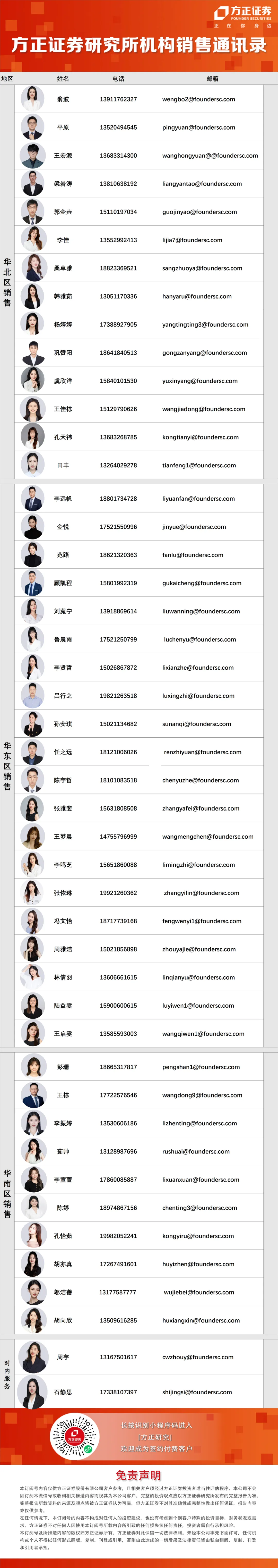 本研究报告由方正证券制作及在中国(香港和澳门特别行政区、台湾省除外)发布。根据《证券期货投资者适当性管理办法》,本报告内容仅供我公司适当性评级为 C3 及以上等级的投资者使用,本公司不会因接收人收到本报告而视其为本公司的当然客户。若您并非前述等级的投资者,为保证服务质量、控制风险,请勿订阅本报告中的信息,本资料难以设置访问权限,若给您造成不便,敬请谅解。 在任何情况下,本报告的内容不构成对任何人的投资建议,也没有考虑到个别客户特殊的投资目标、财务状况或需求,方正证券不对任何人因使用本报告所载任何内容所引致的任何损失负任何责任,投资者需自行承担风险。 本报告版权仅为方正证券所有,本公司对本报告保留一切法律权利。未经本公司事先书面授权,任何机构或个人不得以任何形式复制、转发或公开传播本报告的全部或部分内容,不得将报告内容作为诉讼、仲裁、传媒所引用之证明或依据,不得用于营利或用于未经允许的其它用途。如需引用、刊发或转载本报告,需注明出处且不得进行任何有悖原意的引用、删节和修改。