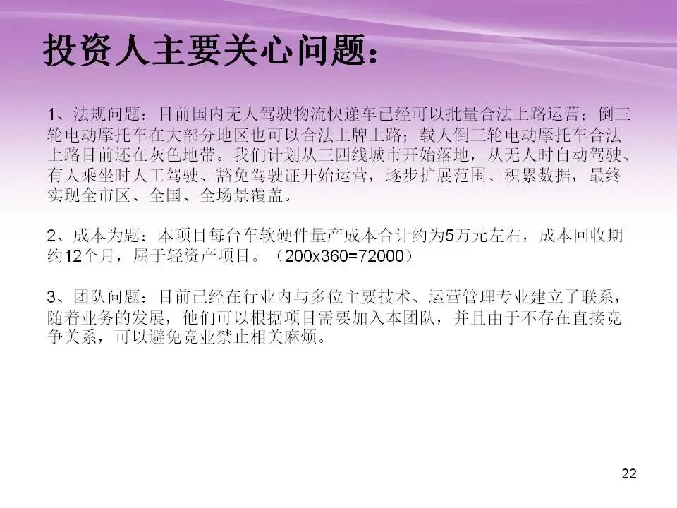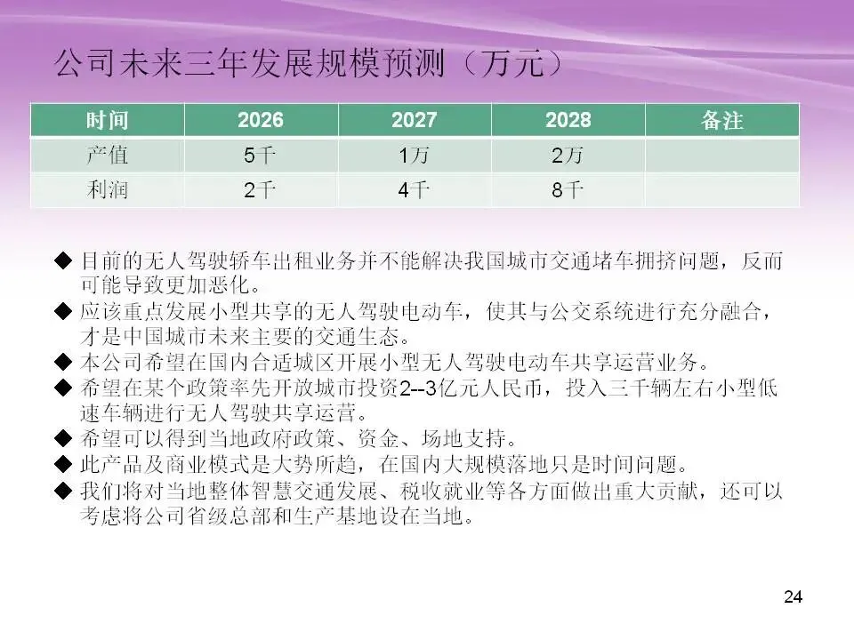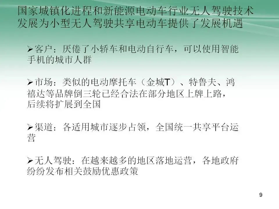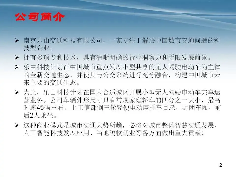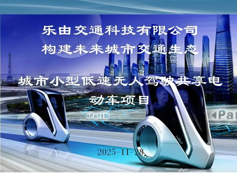 南京乐由交通科技有限公司,专注于解决中国城市交通问题的科技型企业。拥有多项专利技术,具有清晰明确的行业洞察力和无限发展前景。乐由科技计划在中国城市重点发展小型低速共享的无人驾驶电动车为主体的全新交通生态,并使其与公交系统进行充分融合,构建中国城市未来主要的交通生态。乐由科技所应用车辆外形尺寸只有常规家庭轿车的四分之一大小,最高时速45公里左右,倒三轮结构,符合工信部轻便电动摩托车目录要求,封闭车厢,前后2人乘坐,单独整车售价八千左右,加装无人驾驶系统后可以实现城市区域整体AI智能化运营,结合大数据技术,将成为未来城市核心数据中心,全面为市民幸福便捷生活赋能。这种产品和商业模式将是城市发展大势所趋,必将对城市整体智慧交通发展、人工智能科应用、当地税收就业等各方面做出重大贡献!