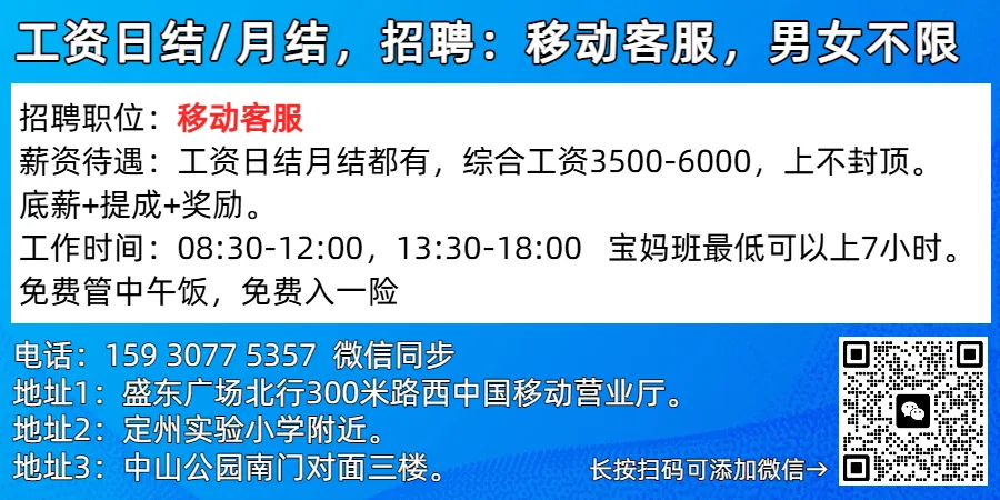 综合招聘电话:么 15176325664公司地址:定州市新妇幼医院西行1公里路南圆通速递。
