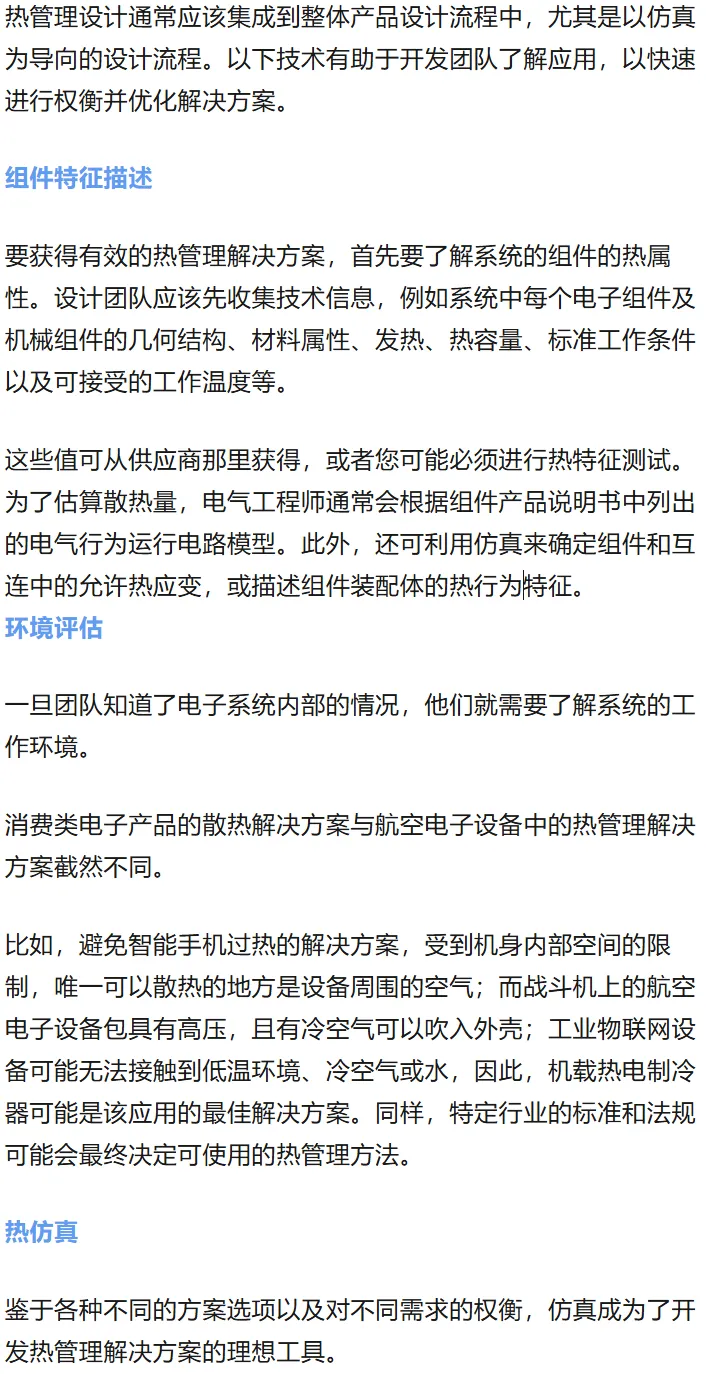 被动散热通常是首选方法,因为其不消耗能量,没有活动部件,而且更具成本效益。不过,考虑到被动散热管理方案永远无法将设备温度降至环境温度以下,又或者被动系统不具备所需的热性能,因此,设计中还会包含主动系统。