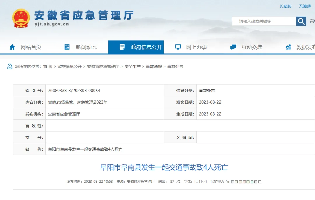 8月22日,安徽省应急管理厅网站发布一起情况通报:8月21日,阜阳一公司重型货车追尾正在等待红灯放行的小型轿车,造成小型轿车上驾驶员和3名乘车人经抢救无效死亡。