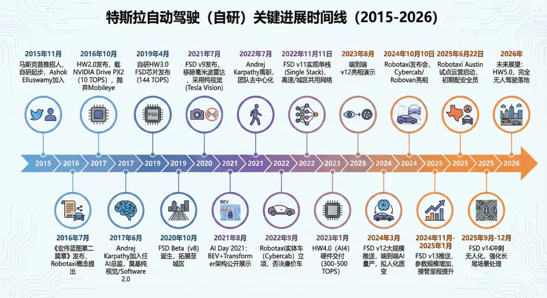 2025年9月 - 12月 | FSD v14 冲刺无人化 FSD v14 开始分批推送(v14.2 于 2025 年底面世)。 特性: 可实现点到点的自动驾驶能力,进一步强化了端到端的长尾场景处理能力,为完全无人驾驶(Unsupervised)做最后冲刺。
