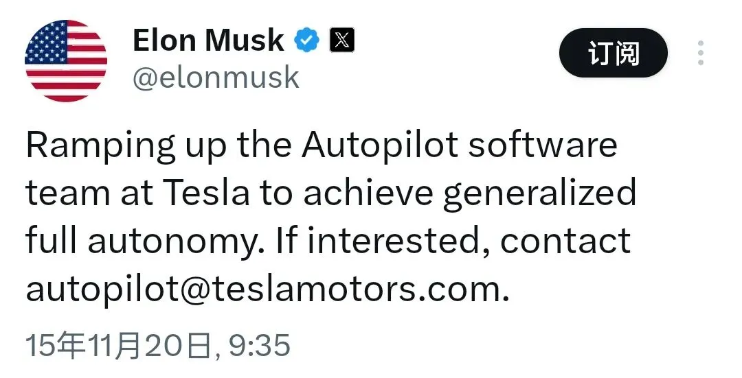 2015年11月 | 梦的开始 Elon Musk 在 Twitter 上发布了著名的招聘推文:“Ramping up the Autopilot software team at Tesla to achieve generalized full autonomy.”(正在扩充特斯拉Autopilot软件团队以实现通用完全自动驾驶)。 背景: 当时特斯拉已预感到与Mobileye的合作难以长久,开始秘密布局自研。Ashok Elluswamy(现任特斯拉自动驾驶负责人)正是看到这条推文后加入团队的第一批核心成员。