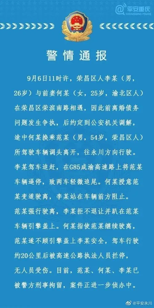 据@平安永川 通报:9月6日11时许,荣昌区人李某(男,26岁)与前妻何某(女,25岁,渝北区人)在荣昌区荣滨南路相遇,因此前离婚债务问题发生争执,后约定到公安机关调解,途中何某换乘范某(男,54岁,荣昌区人)所驾驶车辆调头离开,往永川方向行驶。李某驾车追赶,在G85成渝高速路上将范某车辆逼停,致两车轻微追尾。何某授意范某变道驶离,李某站在车辆前方阻止。范某强行驶离,李某拒不退让并趴在范某车辆引擎盖上。何某指使范某继续驶离,范某遂不顾引擎盖上李某安全,驾车行驶约20公里后被高速公路执法人员拦停,无人员受伤。目前,范某、何某、李某已被警方刑事拘留,案件正进一步侦办中。