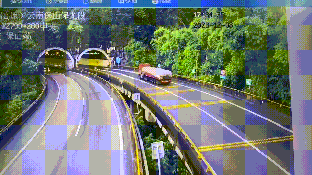 保龙二大队值班室一面通过高空球机观察事故现场,一面迅速指令黄草坝执勤点在镇安坡顶对芒市、腾冲两个方向前往潞江坝的车辆进行临时交通管控,并让最近的路面巡逻警组前往现场处置。5分钟后,执勤民警到达事故现场,大货车与小轿车分别停在道路两侧,相距50米,小轿车左后轮爆胎无法移动,大货车仍能正常行驶。执勤民警告知大货车行驶至大榕树停靠带内等候,并在超车道后方做好安全防护,保证现场交通正常通行。通过高空球机监控视频可以看到小轿车在出桫椤隧道前打滑导致横停在道路中央,几秒后,后方大货车左侧挂到道路中央的小轿车。