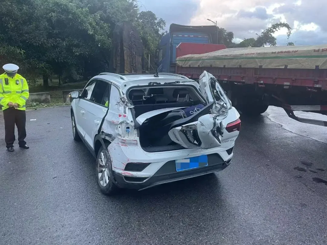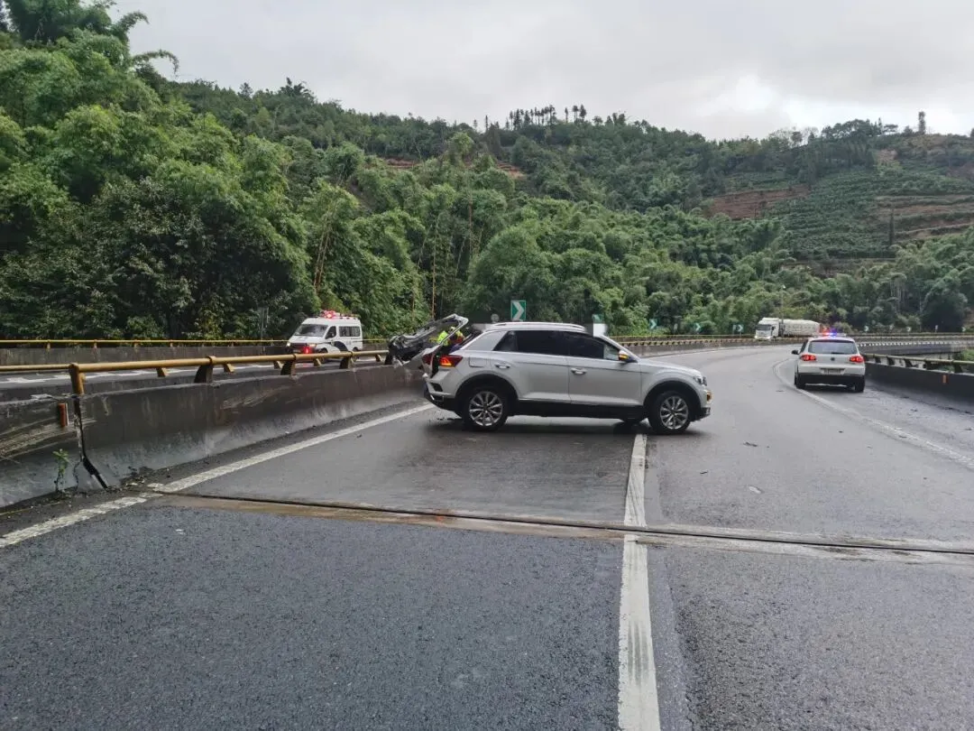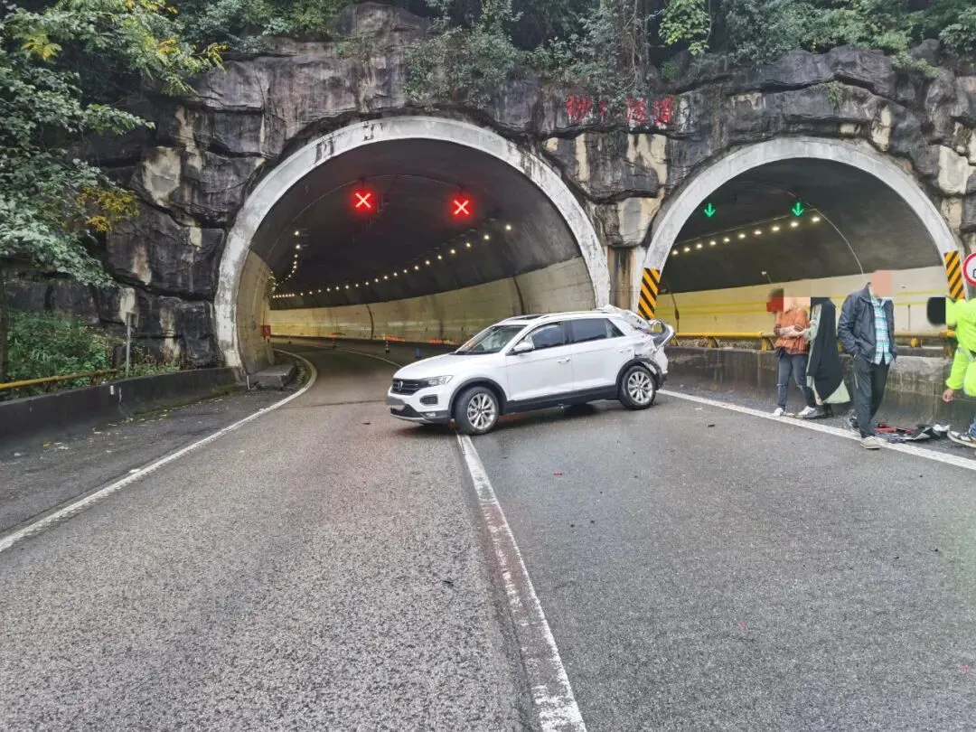 2023年12月8日下午5点40分许,保龙二大队接到报警称:在杭瑞高速公路龙陵往保山方向桫椤隧道出口处一辆货车同一辆小车发生追尾事故。因下雨路面湿滑,且事故发生在隧道出口处,现场十分危险。