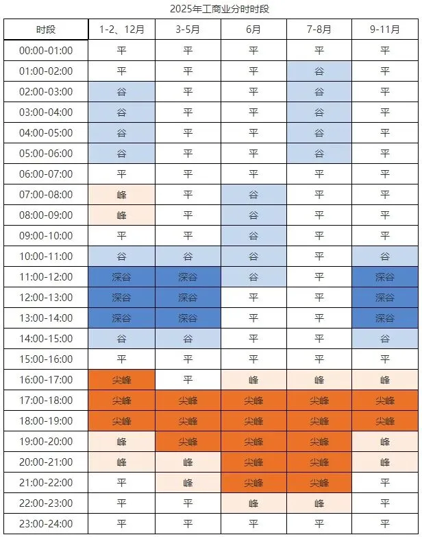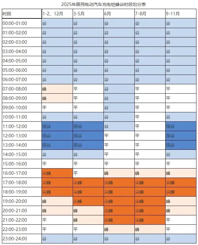 (一)时段划分。除低谷时段23:00-7:00外,其他时段与工商业客户动态分时时段保持一致,每年11月份由国网山东省电力公司向社会公布次年峰谷时段。2025年居民电动汽车充电桩峰谷时段具体详见下表。