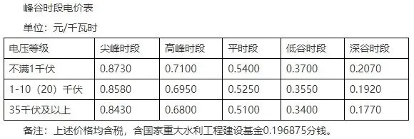 在现行电价标准(每千瓦时0.555元,含税)基础上,深谷时段每千瓦时降低0.333元,低谷时段降低0.17元,高峰时段提高0.03元,尖峰时段提高0.333元。即深谷时段电价为每千瓦时0.222元、低谷时段为0.385元、平时段为0.555元、高峰时段为0.585元、尖峰时段为0.888元。