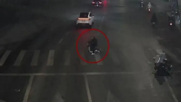 监控画面显示,该男子在交涉中脚步逐渐后移,随后推车准备离开。庞女士察觉异样,立即用手机拍下了其电动车车牌。男子随即骑车闯过红灯,迅速消失在夜幕中。