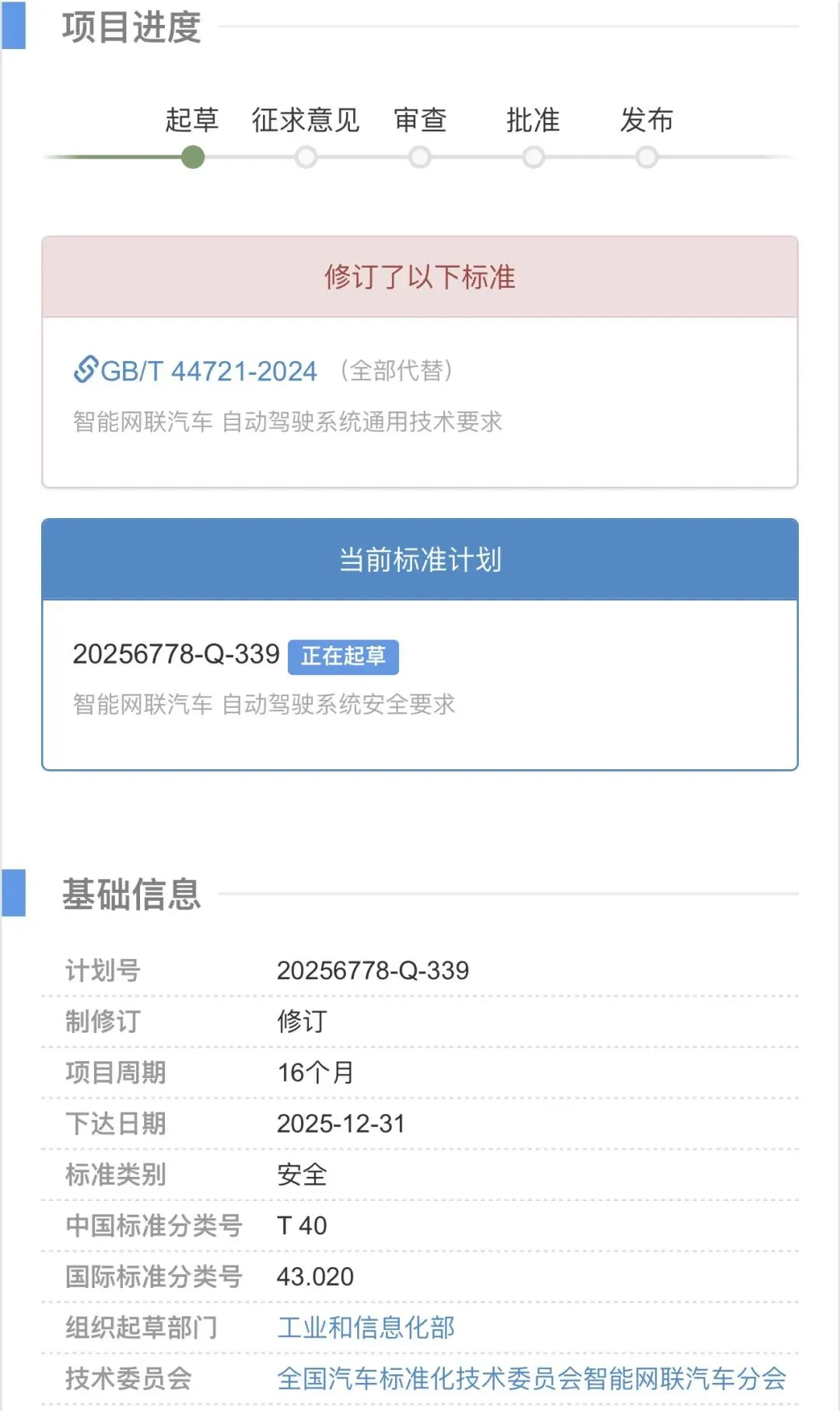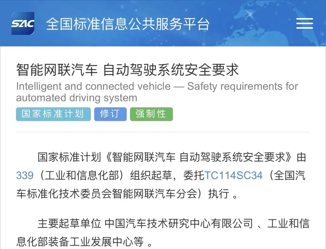 (匠歆汽车讯)2025年的最后一天,国家标准计划发布了GB/T 44721-2024《智能网联汽车 自动驾驶系统通用技术要求》的修订计划,将制定强制性国标《智能网联汽车 自动驾驶系统安全要求》,主要起草单位为中汽中心和装备中心,制定周期16个月,预计2027年4月30日发布。