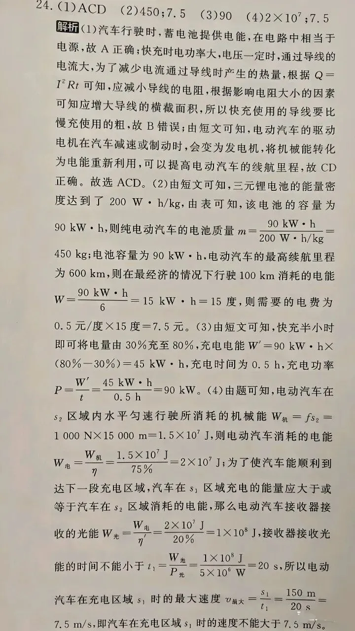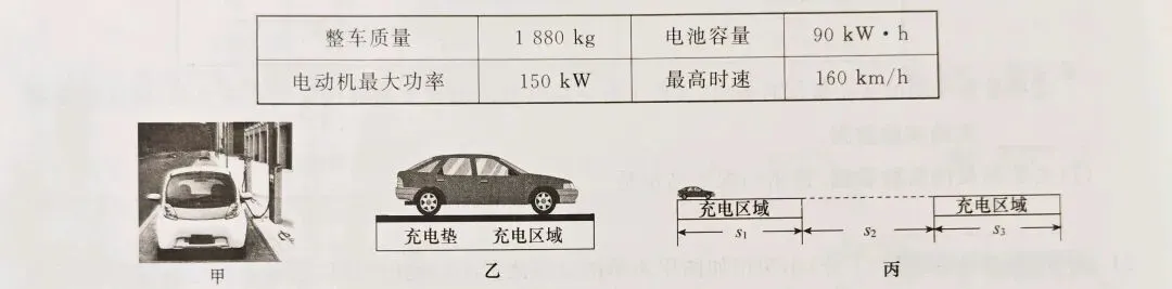 (4)在未来,纯电动汽车可在光伏路面移动充电(如图乙所示),当汽车经过充电区域时,充电垫发出高频光波,通过汽车底盘上的接收器将光能转化为电能,从而为电池充电。一辆电量不足的汽车,匀速通过如图丙所示的充电区域,已知充电区域s₁长为150m,两段充电区域之间的距离s₂为15km,忽略汽车在充电过程中消耗的电能,接收器接收到的光波功率为5000kW,光电池转化为电能的效率为20%,汽车匀速行驶时受到的阻力为1000N。若电池消耗的电能有75%用于维持汽车行驶,则汽车在s₂区域内水平匀速行驶需要耗电___J,为了使汽车能顺利到达下一段充电区域,汽车在充电区域s₁时的速度不能大于___ m/s。
