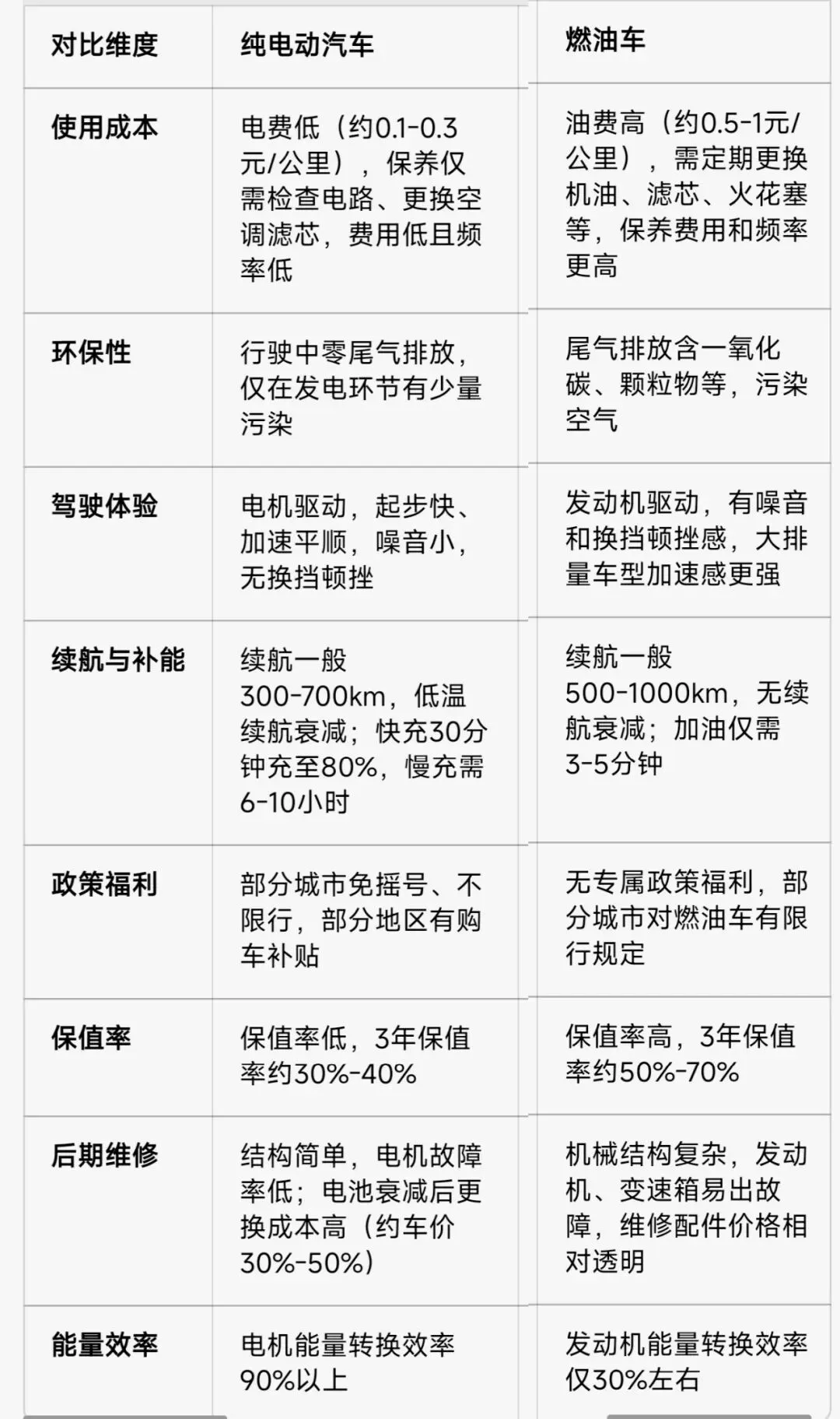 (三)纯电动汽车与燃油车核心对比清单