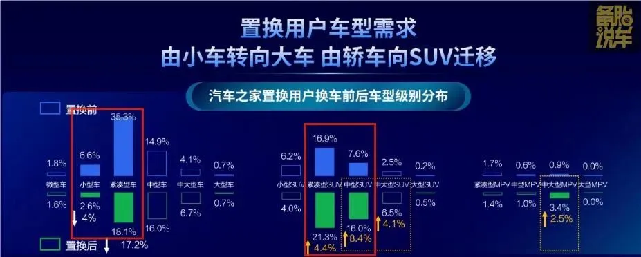 这可不是我瞎讲,有数据的,某车之家发布的《2023中国汽车置换消费洞察》里面做了对比,各种车型置换前后的占比: