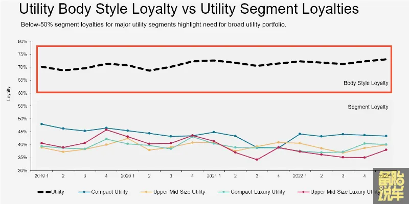 从2019年一直到2023年,SUV这类车型的“用户忠诚度”一直保持在70%左右。