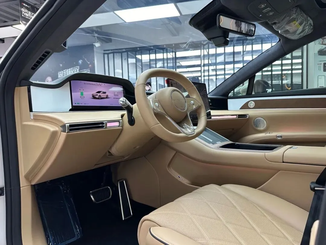 先.说.外观吧。远远看第一眼,真挺唬人的,那个前.脸一体.灯带加上低.趴的姿态——你要不看车标真容易以为是某品牌的EQS。然后我特别喜欢它那个溜背线条,从C柱往后收得特别干净,没有那.种国.产车常见的.多余装.饰,整体挺有力量感。然后我注意.到这.车的轮毂造型,21英寸,漆.面处理.非常细腻,但是刹车卡钳样式我不太喜欢,有点小气了。还有一.点就是,车漆在阳.光下真的挺高级的,有那种金属珠光的感觉,但是我摸了下轮.拱里衬,还是塑料,这个价位嘛,我总觉得要是能给个植绒材料就更好了。