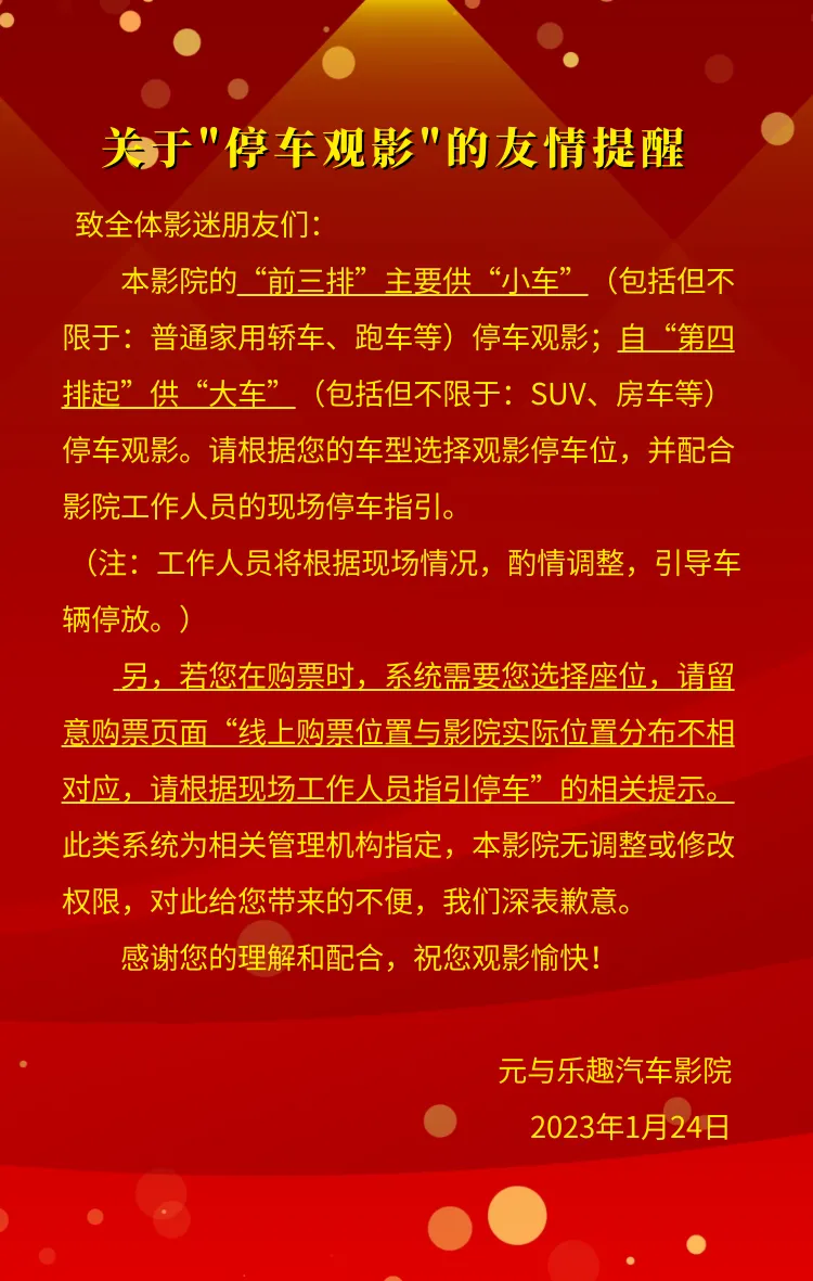 【关于停车观影的友情提醒】 “普通轿车等”前三排,“SUV等”第四排起