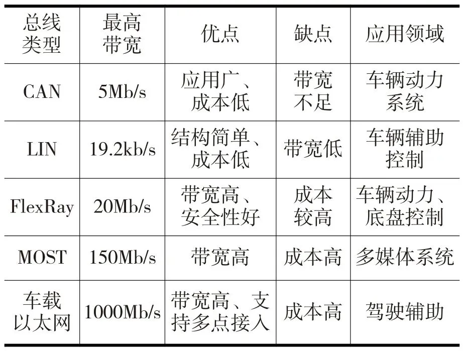 汽车通信电气系统现阶段主要指车用现场总线,是各种传感器、控制单元以及执行器互联的通信网络。目前常用的车用总线有CAN总线、LIN总线、FlexRay总线、MOST总线和车载以太网(Ethernet)等 [2-5],这些几种总线的性能特点如表1所示: