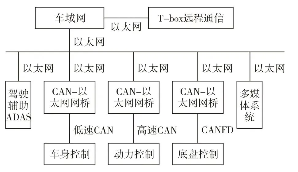 随着高级驾驶辅助系统和智能网联汽车的逐步发展,车辆上各种传感器及控制器数量越来越多,CAN总线已显现出无法应对的趋势。目前以太网通信逐步进入汽车领域,然而现阶段车载以太网通信协议尚未完善,其成本依然偏高。因此当前可行的方案是以当前较为成熟的CAN总线为基础,逐步向以太网过渡,一方面挖掘目前应用广泛的通信协议CAN总线的技术潜力,另一方面完善适应未来汽车要求的以太网技术规则,形成CAN-以太网混合通信架构[6]-[7],如图1所示: