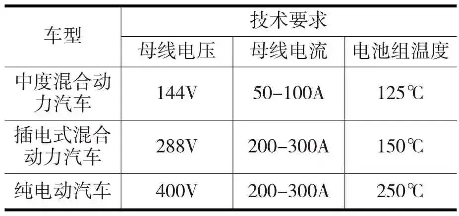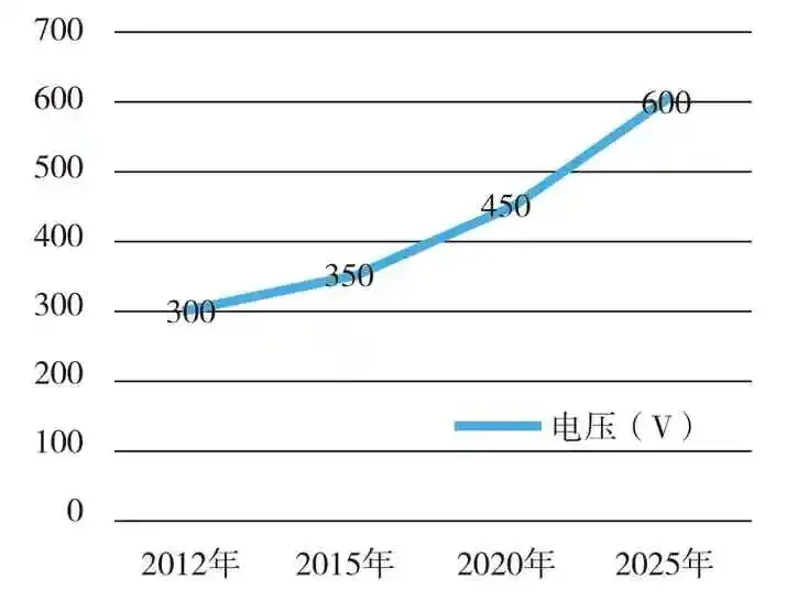 目前各大汽车厂家对于电动汽车并没有统一的母线电压标准,甚至相同厂家的不同车型电压也不一样,通常将电池组电压作为车辆的母线电压,也有将主电机额定电压作为母线电压,通用性较差。如丰田普锐斯混合动力汽车蓄电池电压为直流201.6V;日产Leaf电池电压为350V,三菱i-MiEV电池电压为300V,特斯拉Model S电池电压为400V,比亚迪秦电池电压为460.8V(混动版)和633.6V(电动版)等。从以上数据可以看出,各个车型电压并不统一。由德尔福统计的电动汽车电气要求发展趋势(图3)也可以看出,随着电动汽车电气化程度的提升,电压呈上升趋势。电压升高有两个好处,一是能量/功耗损失小,二是电机驱动效率更高。但提高母线电压会导致保险丝等保护器件以及IGBT等功率器件成本提升,因此选择合适的母线电压需要以当前技术条件为基础。