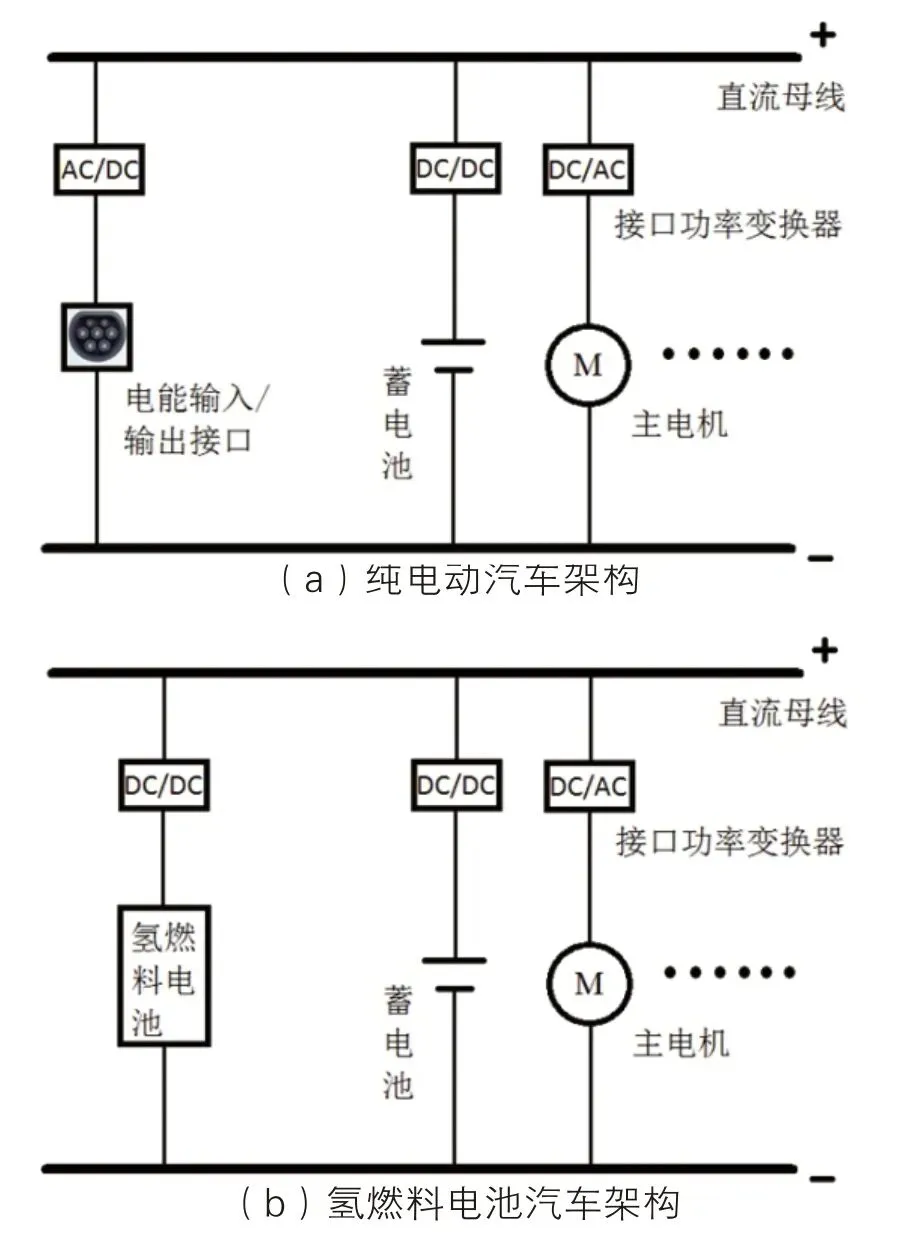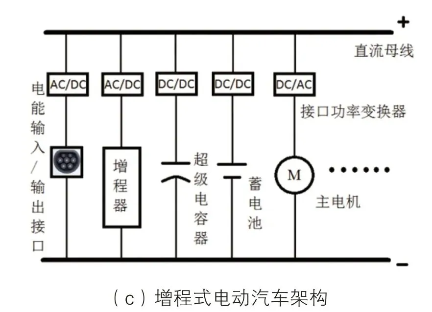 图2为纯电动汽车、氢燃料电池汽车和增程式电动汽车架构示意图。图中直流母线与其他功率型器件通过功率变换器相连,直流母线电压不依赖于储能装置的电压及容量,也可以与驱动电机的额定工作电压相分离,因此在电动汽车动力电气架构中母线电压的设置上具有较大的灵活性 [10]。一旦各方对直流母线电压达成一致,功率型器件的生产厂家可以将器件与功率变换器集成为一体,减少整车生产商的工作量,同时形成标准的零部件供应体系,则电动汽车动力电气架构可基本达成,进一步降低零部件成本,促进电动汽车行业的发展。