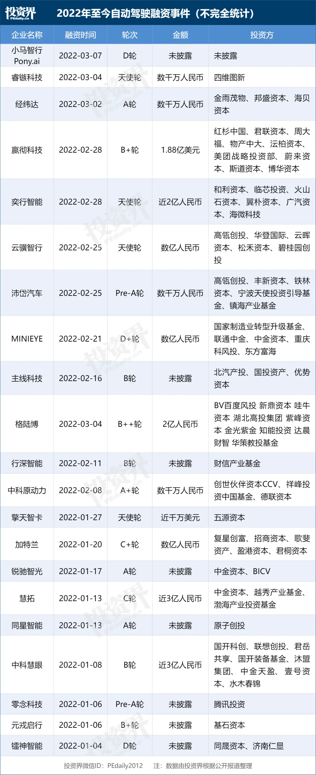 2022年,自动驾驶江湖依旧热闹。据投资界不完全统计,自今年1月至今,自动驾驶行业已发生超过20笔融资事件,其中不乏多笔亿元级别的大额融资,背后更是聚集了一众知名VC/PE。