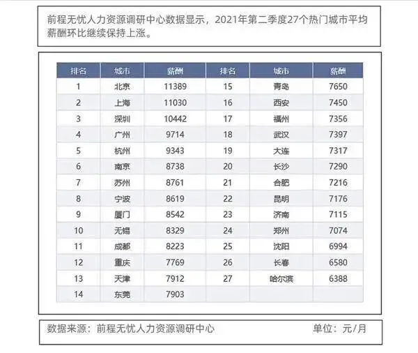 @ZAKER【北京平均月薪达11389 元!过万的只有三座城市】前程无忧发布了 2021 年第二季度 27 座热门城市薪酬调研报告,北京依然独领风骚,当季月平均薪酬 ( 不含年终奖等 ) 为 11389 元,比一季度增加202元。上海、深圳继续紧随其后,分别为 11030 元、10442 元,分别比上季度增加 575 元、195 元。他们也依然是仅有的超过 1 万的三座城市。