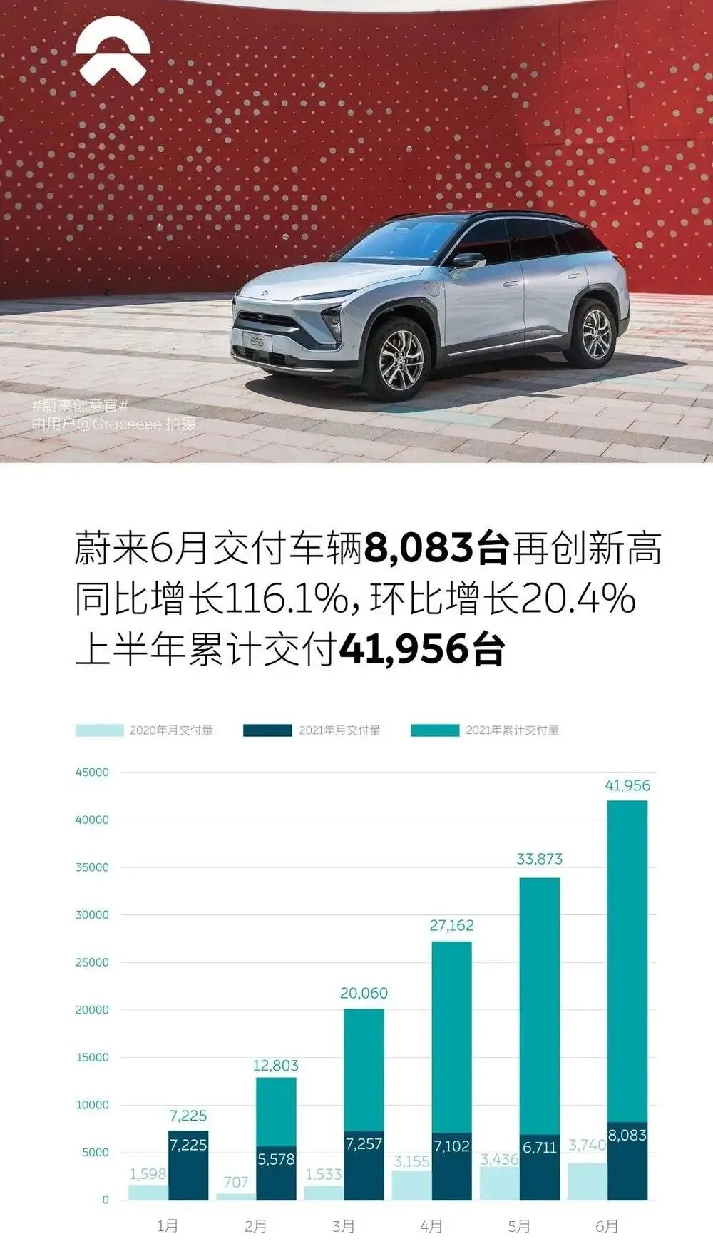 @虎嗅【蔚来6月交付8083台】7月1日,蔚来公布2021年6月交付成绩。蔚来6月共交付智能电动汽车8,083台,首超八千台,创历史新高,同比增长116.1%,环比增长20.4%。蔚来二季度共交付21,896台,同比增长111.9%,连续五个季度正增长。上半年蔚来共交付41,956台,达到去年全年交付量的95.9%。