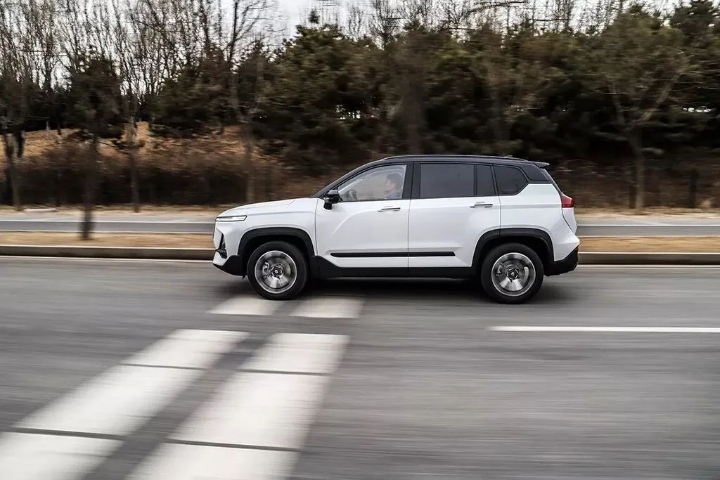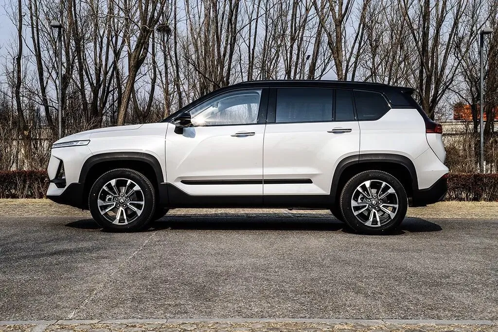 车身侧面比例较为紧凑,向外凸出的黑色轮拱有一份野性,但略微显得不那么协调,双色的车身设计提升了车侧的层次感。车身尺寸方面,长宽高分别为4570/1870/1720mm,轴距为2700mm,属于同级别主流水准。