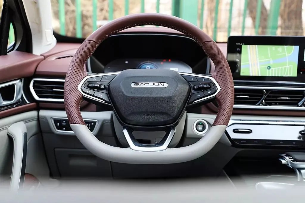 皮质方向盘同样为双色拼接设计,中间部分还进行了打孔处理,皮质较为细腻,但握感偏硬。