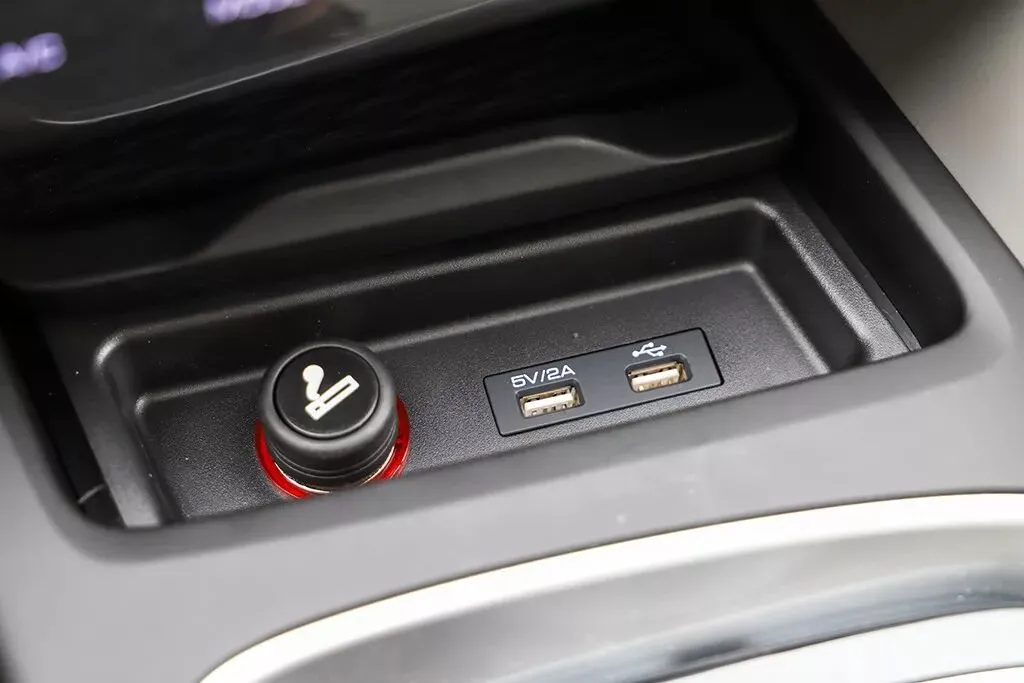 挡把前方的储物空间用来放手机再适合不过了,推开盖板后,下方还配有2个USB接口以及点烟器。