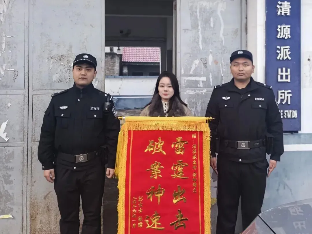 “感谢警察同志,没想到那么快,丢失的手机就被找回来了” 1月5日下午,居民彭女士将一面写有“雷霆出击 破案神速”的锦旗送到清源派出所,再三向帮助找回遗失手机的民警表达谢意。当日上午10时许,彭女士来到清源派出所报警求助,彭女士在元旦假期外出时不慎遗失手机,反复寻找无果。了解情况后,值班民警迅速响应,在与彭女士的细致沟通中,详细询问其出行路线、时间节点等细节,迅速沿其行动路线进行走访排查,同时调取沿途商铺、路口的公共视频,尝试找寻手机。
