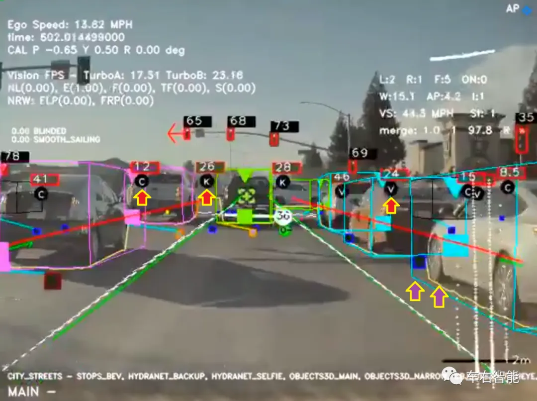 3 紫色箭头,上图中的紫色箭头指出了两个关键的视觉识别结果。一个是立体的车辆外轮廓包围框,另一个是车辆轮胎的接地轮廓线(黄色)。基于单目摄像头的3D目标识别方法,就在神经网络的框架中,就有N多种方法了,我们在这里也没有必要猜测Autopilot的具体识别方法到底是哪一种,线索非常有限。