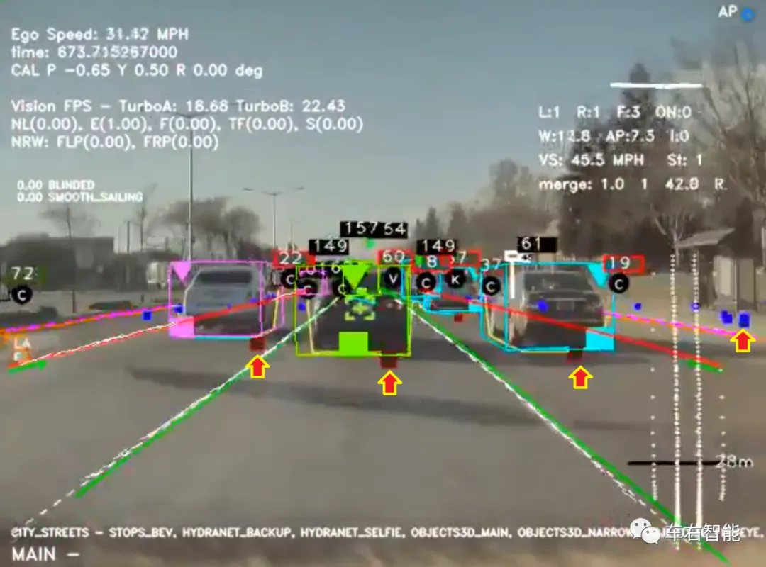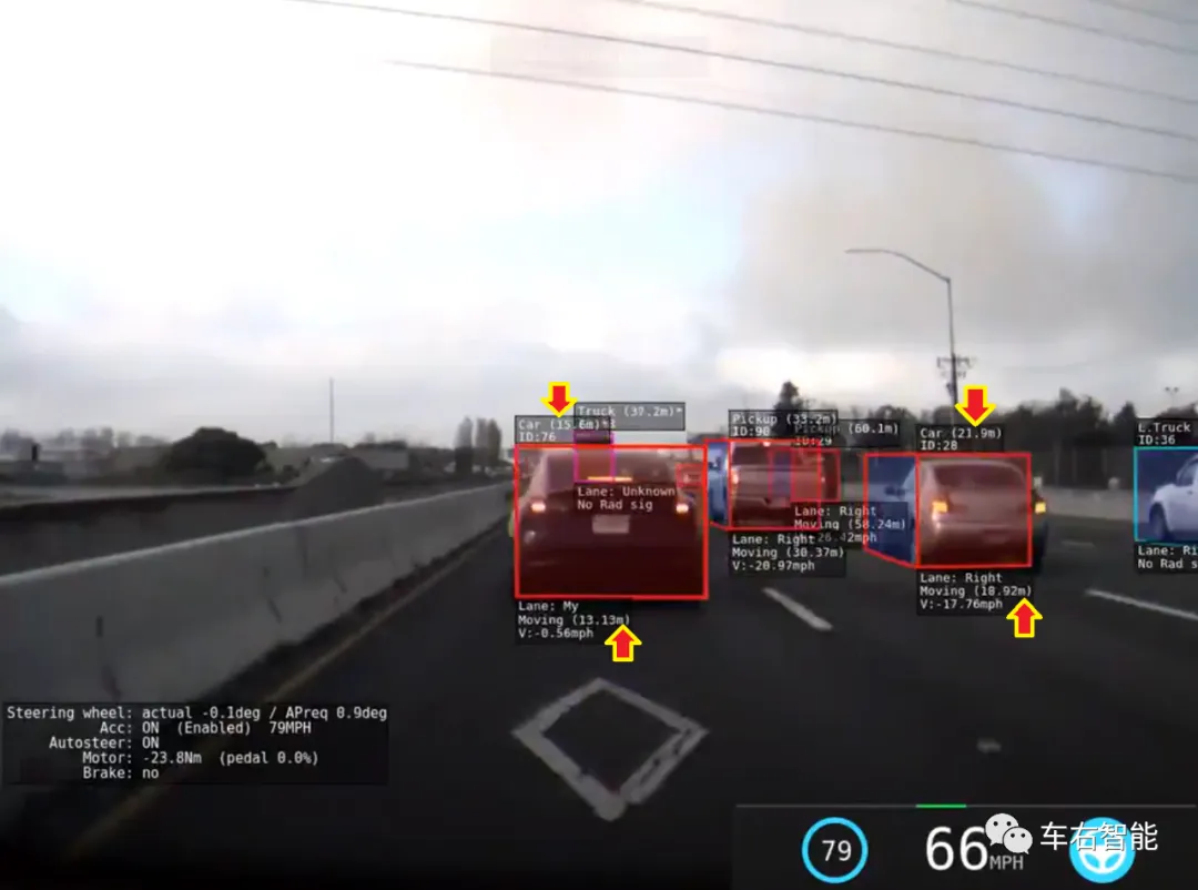 2 红色箭头,在车辆的分类结果之上,Autopilot给出预测的关键3D信息——距离信息。距离信息的估算来源可能由两部分组成,一部分是视觉识别和预测的结果,两一部分是毫米波雷达的测量结果。注意这里的差别,一个是“预测”,另一个是“测量”,所以不难想象这两部分测距数值上的差异。